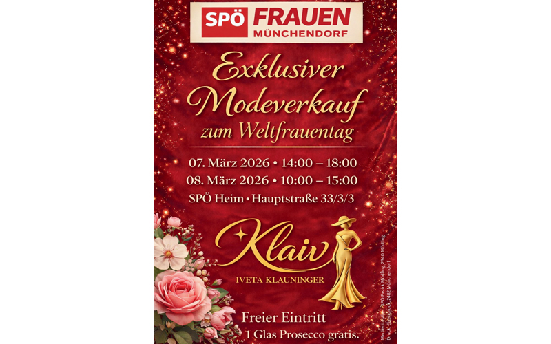 Der 8. März ist der Weltfrauentag. Die SPÖ Frauen Münchendorf nehmen diesen besonderen Tag zum Anlass, um am 7. und 8. März 2026 zu einem exklusiven Modeverkauf in das SPÖ-Heim in der Hauptstraße 33/3/3 einzuladen. Samstag: 14.00 – 18.00 h. Sonntag: 10.00 – 15.00 h. Unterstützt wird die Initiative von der SPÖ Münchendorf und dem SWV Mödling. Einkaufsgutscheine mit einem 10%-Rabatt sind vor Ort erhältlich. Freier Eintritt.